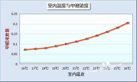 根據日本科學家計算,室內溫度每升高1℃,甲醛濃度增加12-13%。如下圖所示,20℃時甲醛是0.1毫克,25℃時就接近0.2毫克。