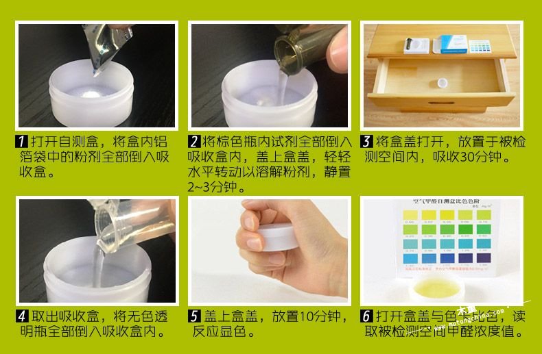 8、甲醛自測盒中的試劑,以及顯色反應后的液體,一定不要弄到家具、臺面、地面上,如不慎濺落上,請一定立即用紙巾或毛巾擦拭干凈。建議判定結果和 拍照后,及時至于垃圾箱內。