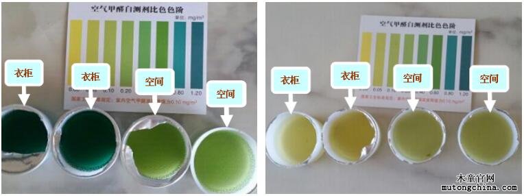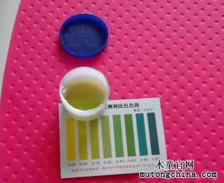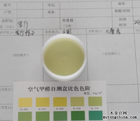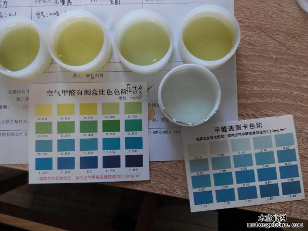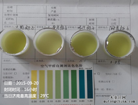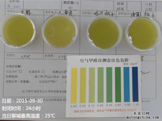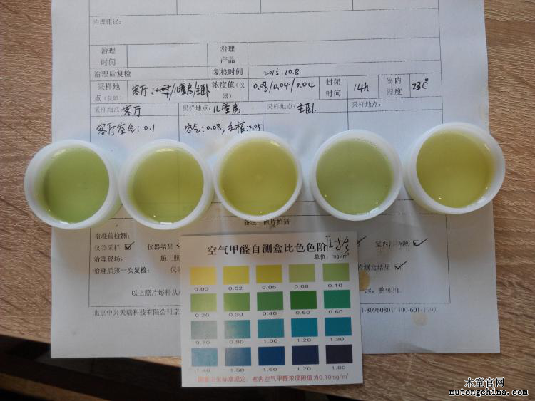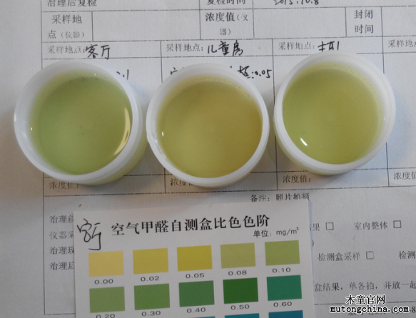 這張照片是濟(jì)南木童環(huán)保科技公司在客戶(hù)家中治理甲醛污染之前,用甲醛自測(cè)盒檢測(cè)的結(jié)果,其中藍(lán)綠色(0.8左右)的是客廳柜子里的檢測(cè)結(jié)果,中間偏黃色(0.05左右)的是主臥室空間的結(jié)果,右邊換綠色(0.1左右)的是兒童房空間的結(jié)果。
