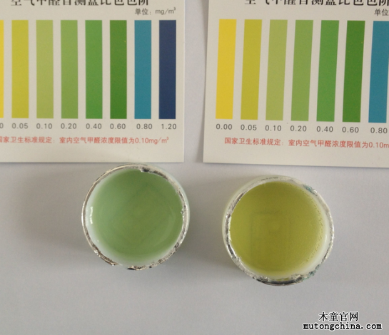 下面這張照片顯示的是在木童工程師實(shí)施了甲醛污染治理后的檢測(cè)結(jié)果。從左至右分別是客廳、兒童房、主臥三個(gè)房間檢測(cè)結(jié)果,試劑顏色非常接近,差異微小,但卻依然清晰可辨:客廳最接近0.1毫克,主臥與0.08接近,兒童房在0.02-0.05毫克之間。細(xì)小的差異全都顯現(xiàn)了出來(lái)。