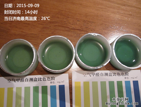 這張照片是濟(jì)南木童環(huán)保科技公司在客戶家中治理甲醛污染之前,用甲醛自測盒檢測的結(jié)果,其中藍(lán)綠色(0.8左右)的是客廳柜子里的檢測結(jié)果,中間偏黃色(0.05左右)的是主臥室空間的結(jié)果,右邊換綠色(0.1左右)的是兒童房空間的結(jié)果。
