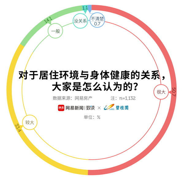 網(wǎng)易房產(chǎn)的調(diào)查數(shù)據(jù)顯示,在居住環(huán)境與身體健康的關(guān)系中,有50.7%的受訪者認為居住環(huán)境和身體健康的關(guān)系很大,33.4%認為關(guān)系較大,只有1.1%的人覺得沒有關(guān)系。