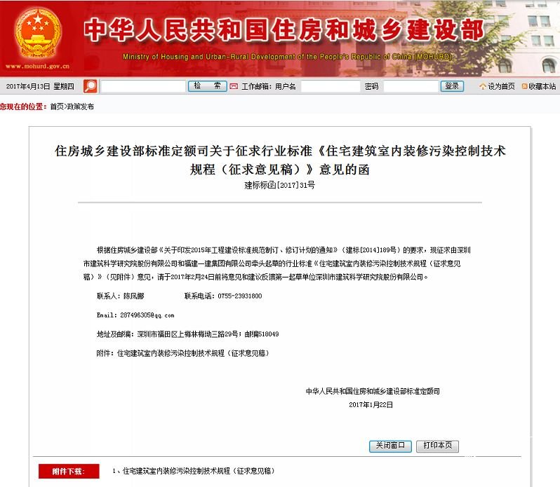 由國家住房和城鄉(xiāng)建設(shè)部提議,深圳建筑科學(xué)研究院、福建一建集團(tuán)有限公司主編,清華大學(xué)、上海建筑科學(xué)研究院、中國建筑科學(xué)研究院、(北京中興天瑞科技有限公司旗下子公司)濟(jì)南木童環(huán)??萍加邢薰?、萬科企業(yè)股份有限公司、中國林科院木材工業(yè)研究所等十多家專業(yè)單位聯(lián)合編制的《住宅建筑室內(nèi)裝修污染控制技術(shù)標(biāo)準(zhǔn)》行業(yè)標(biāo)準(zhǔn),已報(bào)送住房城鄉(xiāng)建設(shè)部標(biāo)準(zhǔn)定額司,并得到了高度評(píng)價(jià),在完成征求廣泛建議完善后,將按法定程序進(jìn)行定稿、公布、執(zhí)行。